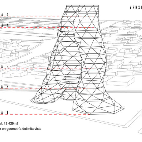 El proyecto se construye a base de dos parámetros fundamentales, la vista marcada por dos hitos: la puesta de sol y el Cerro Mauco; y los ejes provenientes de las calles colindantes que generan un recorrido alrededor de las torres (Planta 3 - Versión 6)